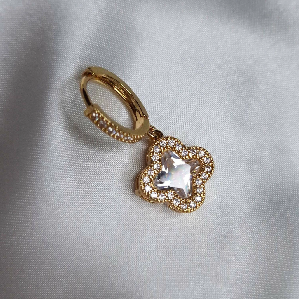 Ele é formado por uma argolinha dourada com pedrinhas brilhantes, e na ponta, um pingente em formato de flor de quatro pétalas, contornado por mais brilho e com um cristal no centro que rouba a cena! 🌸💎