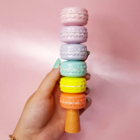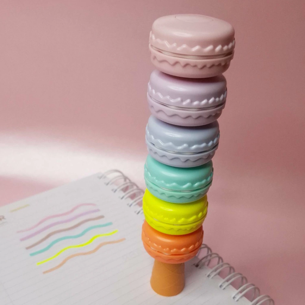 Esse kit vem com 6 marca-textos em tons pastéis, cada um com formato de mini macaron que se encaixam entre si, formando uma composição linda e super charmosa na sua mesa 💖💛💜💚💙🧡
