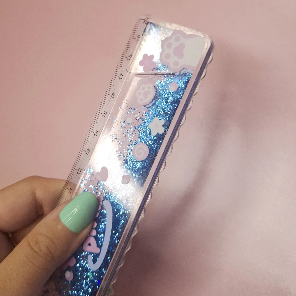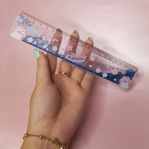 Transforme sua mesa com essa régua de 20cm cheia de glitter azul e estampa de patinhas de gato! Um item prático que vai deixar sua papelaria mais divertida e encantadora! 🐱💖